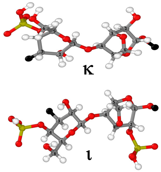 In this context, kappa/iota-hybrid carrageenans (KIs) [10], which consist of a random block copolymer of sequences of kappa-carrageenan (κ) and iota-carrageenan (ι) diads (disaccharides of D-galactose and 3,6-anhydrogalactose units linked by specific glycosidic bonds, see Figure 1), have emerged as promising alternatives to traditional commercial blends. Industrially known as weak kappa or Kappa-2 [11,12], these copolymers form thermo-reversible hydrogels with intermediate elasticity in comparison to those of kappa- and iota-carrageenan, offering unique structural and performance advantages in certain applications [11,12]. Moreover, they are predominantly sourced from wild seaweeds in cold waters, unlike kappa- and iota-carrageenans, which are mainly obtained from the intense farming of warm-water species, with associated production issues [13]. The ratio between kappa-carrageenan and iota-carrageenan diads in a KI is set by biology, that is, the family and genus of seaweeds used to extract the KI. So, instead of mixing at different ratios to tune the properties of the blend, the properties of a KI are tuned by choosing the correct seaweed and isolating the corresponding copolymer [10,14]. This makes hybrid carrageenans not only an attractive option for alternative sourcing but also a potentially more cost-effective solution by eliminating the need for blending different types of carrageenans.