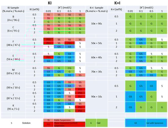 For κ-rich KI samples, ionic strength played a more significant role, with gel formation particularly challenged at elevated K+ concentrations (≥0.5 mol/L for samples J, and >1 mol/L for the corresponding blend). While potassium ions more effectively induce the helical and aggregated states of kappa-carrageenan, salt-out effects at large ionic strength may lead to precipitation, compromising gel formation. A similar high salt sensitivity was observed in samples E and M at a K+ concentration of 1 mol/L, where stable suspensions or solutions are observed, whereas low ionic strengths and low polysaccharide concentrations hindered the gelation.
