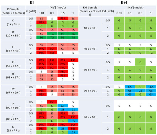 In NaCl, the differences between KI and blends are even more striking, which points toward the Na+ specificity of these copolymers when they contain between 50 and 90 mol% κ. The gel formation for blends containing more kappa-carrageenan was mostly conditioned by low polysaccharide concentrations, not showing much dependence on the ionic strength (contrarily to what is seen in KCl). As expected, due to the non-specific ion response of iota-carrageenan [8], ι-rich KI samples (C′ and D′) demonstrated consistent gelling behaviors in both Na+ and K+. In contrast, κ-rich samples (I′, J′, and K′) required higher polysaccharide concentrations to form gels in NaCl than in KCl.