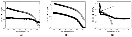 A monotonic increase of both moduli with the decreasing temperature, where no crossover is detected and thus no Tg, is displayed in Figure 4b. This type of cooling suggests that gelation occurred at temperatures above 85 °C as G′ is larger than G″ in the whole temperature range tested. Note that for sample C′ at 2 wt.% in 1 M NaCl, G′ is always smaller than G″ during the whole cooling down to 25 °C (see Figure S5C). This indicates that sample C′ remained in the liquid state during cooling. The crossover between G′ and G″ occurred during the time spent at 25 °C for the record of the remaining gel properties (see Figure S9C showing G′ > G″ at large strains). Finally, the cooling illustrated in Figure 4c shows two steps in the thermal evolution of G′ (or G″). A temperature T2 (indicated by an arrow) lower than Tg signals the onset of a second gelling process corresponding to the elastic reinforcement (increase in G′) of the gel network established at Tg. Two-step gelation has been reported in K+I (see for instance [19,20,22,24,41]) and in hybrid carrageenan samples [42]. Tg and T2 are listed in Table 2 for all samples tested in KCl and in Table 3 for all samples tested in NaCl.