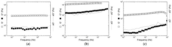 Figure 4 gives illustrative thermorheological curves measured during the cooling of hot KI and K+I solutions in order to assess the sol–gel transitions. All cooling curves are available in Figures S4 and S5 in the Supplementary Materials, for gels formed in KCl and NaCl, respectively. Three types of cooling were observed. A clear sol-to-gel transition characterized by the crossover between the shear storage modulus G′ and the shear loss modulus G″, occurring at the gel transition temperature Tg, can be inferred from the data such as those plotted in Figure 4a,c.