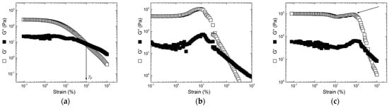 Strain sweeps performed on (a) sample K gelled in 0.5 M KCl with a concentration of 0.5 wt.%, (b) sample K gelled in 0.01 M KCl with a concentration of 0.5 wt.%, and (c) sample C gelled in 1 M KCl with a concentration of 2 wt.%. The arrow in (a) shows the strain γF for the strain-induced fluidization of the gel. The arrow in (c) indicates the strain hardening showing up after the first strain softening at a smaller strain.
