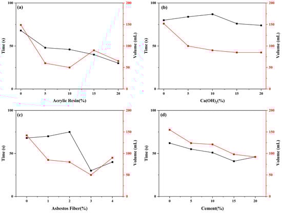 Variation in total filtration time and filtration volume with different ingredients: acrylic resin (a), Ca(OH)2 (b), asbestos fiber (c) and cement (d).