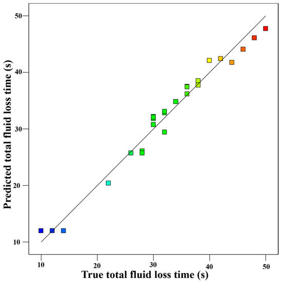 Using acrylic resin dosage (A), calcium hydroxide dosage (B), asbestos fiber dosage (C), and cement dosage (D) as independent variables, and total fluid loss time (Y) as the dependent variable, a regression equation was established by fitting the experimental data. The resulting regression equation is expressed as follows: