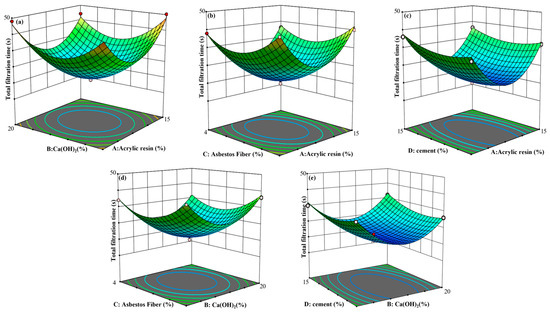 From Figure 4a, when the dosage of asbestos fiber is fixed at 3% and that of cement is fixed at 11.25%, the response surface for acrylic resin is steeper, while that for calcium hydroxide is flatter. This indicates that acrylic resin significantly affects the total fluid loss time, whereas calcium hydroxide has an insignificant effect. Furthermore, the total fluid loss time stays low, with a minimum below 35 s, effectively satisfying the rapid fluid loss criteria. Currently, the synergistic value is −1.0, indicating mutual antagonism between the two. Figure 4b reveals that with calcium hydroxide dosage set at 20% and cement dosage set at 11.25%, the asbestos fiber surface is steeper compared to the flatter surface for acrylic resin. This indicates that asbestos fiber has a greater influence on total fluid loss time than acrylic resin. The synergistic value between the two is 0, indicating that the addition of the two does not affect each other. As illustrated in Figure 4c, with calcium hydroxide dosage at 20% and asbestos fiber dosage at 3%, the acrylic resin surface is steeper compared to the flatter cement surface. This suggests that acrylic resin has a stronger influence on total fluid loss time than cement. Figure 4d shows that with acrylic resin dosage at 10% and cement dosage at 11.25%, the asbestos fiber surface is steeper, whereas the calcium hydroxide surface is flatter. This indicates that asbestos fiber has a greater influence on total fluid loss time than calcium hydroxide. The synergistic values of acrylic resin and cement, asbestos fiber, and calcium hydroxide were all −0.25, indicating that there was a slight antagonistic effect between them, but the numerical value reflected that the effect was not significant. Figure 4e reveals that with the acrylic resin dosage fixed at 10% and asbestos fiber dosage fixed at 3%, the trends of cement and calcium hydroxide dosages on total fluid loss time are comparatively smaller. The promoting effect of calcium hydroxide on cement is obvious and so the synergistic value between the two is 0.75 [22].
