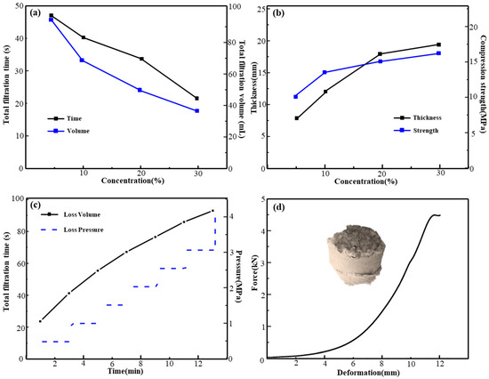 As shown in Figure 5a, within the 5~30% concentration range, the total fluid loss time for the rapid fluid loss and solidification plugging slurry is 18~47 s, with a fluid loss volume of 44~96 mL. The short total fluid loss time of the plugging slurry indicates a rapid fluid loss rate, which helps to effectively prevent leakage. With an increase in the plugging agent dosage, the fluid loss volume of the slurry reduces. This reduction is due to the higher solid content in the slurry with increased dosage, forming a denser sealing layer. Therefore, in plugging operations, the dosage of the plugging agent should be adjusted according to specific conditions to achieve optimal plugging performance.