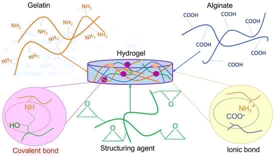 The structure of hydrogels is formed due to several factors of its spatial network formation [40,41]. In particular, gelatin complexes with ionic polysaccharides are primarily formed by intermolecular electrostatic interactions and hydrogen bonds [42,43]. Ionic interactions of the complementary functional groups allow fragments of gelatin macromolecules to bind to sodium alginate macromolecules. The formation and stability of such polyelectrolyte complexes depend on various factors, including the ionization degree of polyelectrolytes, the charge distribution along the polymer chains, the nature and position of ionic groups, the flexibility of the polymer chain, and the molecular weight and ratio of polyelectrolytes, as well as the temperature, ionic strength, and pH of the reaction medium [44]. Under specific conditions—such as certain ratios of biopolymers, their concentration, pH, and ionic strength of the medium, these complexes can form hydrogels independently [45,46,47].