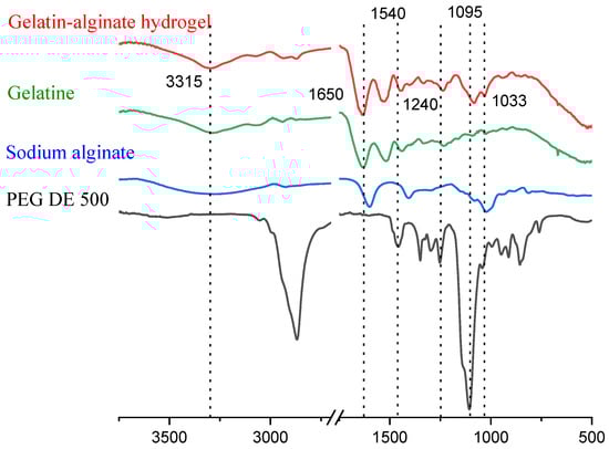 The FTIR spectra of the PEGDE 500, alginate, gelatin, and gel fraction of the reaction product isolated after structuring gelatin–alginate.