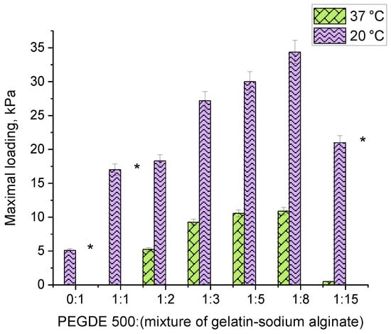 The force transmitted by the hydrogel under uniaxial compression at a strain of 4.5 mm. (For hydrogels obtained at 20 °C *—hydrogels are destroyed under compression, and the rest of the samples remained intact).