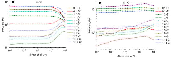 Strain (amplitude sweep) for gelatin–alginate hydrogels crosslinked with different amounts of PEGDE 500 at a temperature of 20 °C (a) and 37 °C (b).