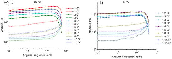 A frequency sweep for gelatin–alginate hydrogels crosslinked with different amounts of PEGDE 500 at a temperature of 20 °C (a) and 37 °C (b).