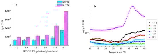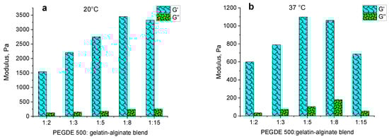 The viscoelastic characteristics of gelatin–alginate hydrogels crosslinked with different amounts of PEGDE 500 at a temperature of 20 °C (a) and 37 °C (b).