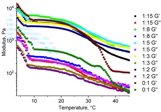 The hydrogel sample without a structuring agent demonstrates the strongest temperature-dependent property change, as at 37 °C it becomes a viscous liquid (Figure 10). In contrast, for chemically structured samples, this decrease is slower, and even at 45 °C they still retain the properties of a solid (unlike liquids for which the moduli are identical). At the minimum ratio of 1:15, a strong temperature dependence is observed, but it differs significantly from the unstructured hydrogel sample. For all of the other ratios, the behavior is similar, supporting the previously obtained results of how within the studied temperature range, all of the samples of structured hydrogels retain the properties of elastic solids.