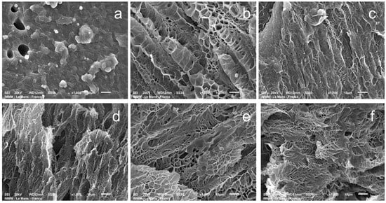 SEM images of gelatin–alginate hydrogels at different ratios of the structuring agent PEGDE 500 to the gelatin–alginate blend: 1:1 (a); 1:2 (b); 1:3 (c); 1:5 (d); 1:5 (e); and 1:15 (f), swollen twice their original size in water.