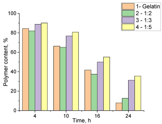 An investigation of the hydrogels degradation under enzymatic action is essential for assessing and predicting their behavior in vivo and in specific clinical cases [54]. The enzymatic degradation of the synthesized hydrogels was studied in vitro under model conditions using the protease enzyme (2.5 mg/mL in PBS). The percentage of residual polymers in the hydrogel was determined at specified intervals (Figure 12).