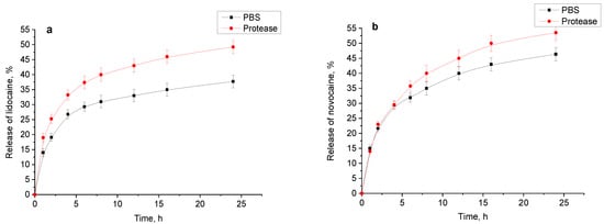 The release of drugs from hydrogels was evaluated using a vertical Franz cell and hydrogel sample 4 (preparation conditions are specified in Table 1) saturated with the corresponding drug. The resulting release profiles exhibit patterns (Figure 13a,b). For lidocaine and novocaine, the typical initial rapid release for such systems was observed [25]. During this phase, 25–30% of the drugs were released, then the process slows down and 35–50% were released over the next 24 h. The presence of the proteolytic enzyme appears to accelerate the release of these drugs after the initial rapid phase, likely due to the gradual degradation of the hydrogel.