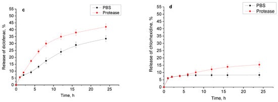Kinetics of the drug release into phosphate-buffered saline (PBS) and into a 0.001% protease solution in PBS at 37 °C: lidocaine hydrochloride (a); novocaine (b); diclofenac sodium salt (c); and chlorhexidine digluconate (d).