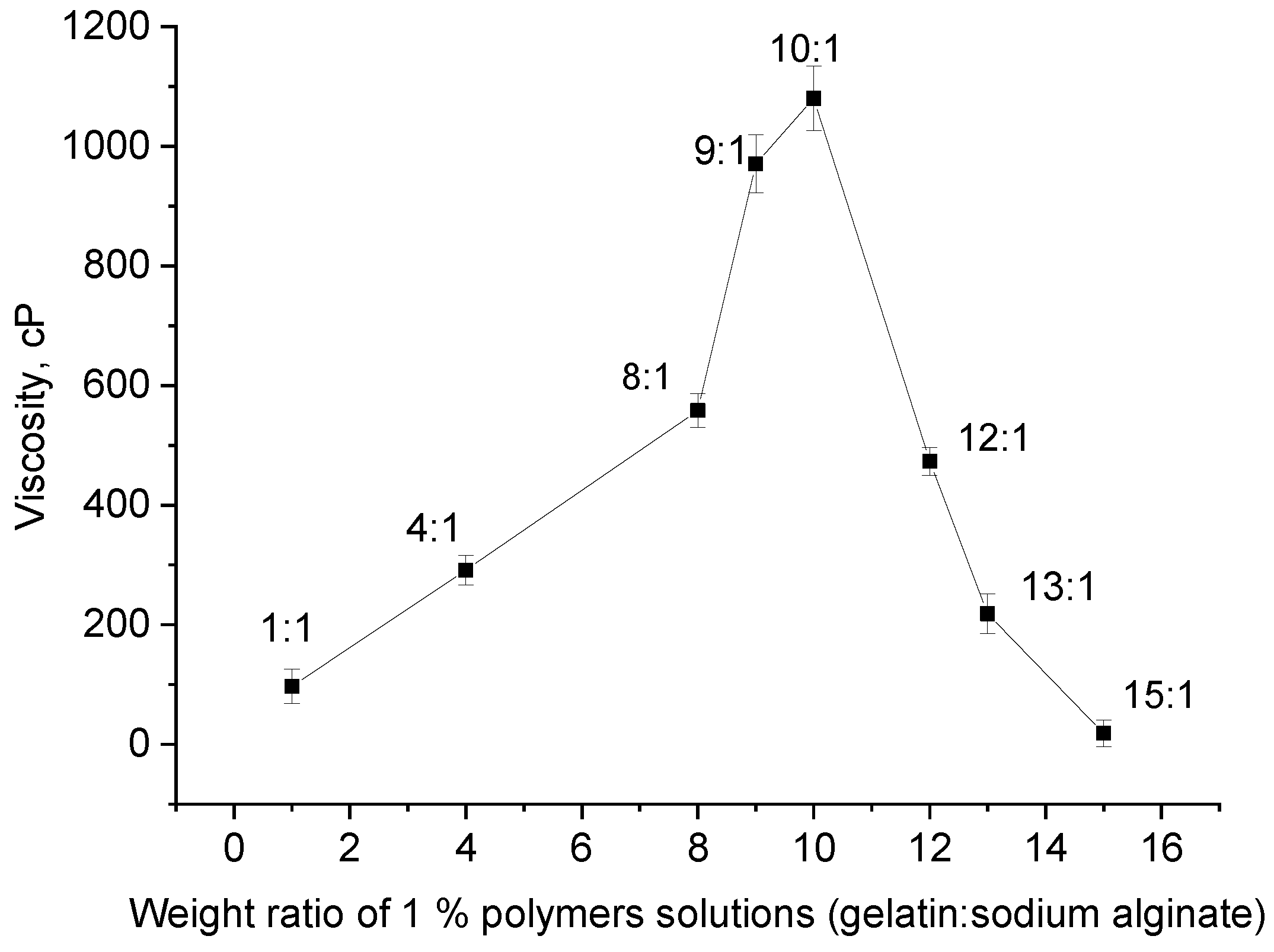 We propose to increase the number of crosslinks by structuring a mixture of biopolymers that have already formed polyelectrolyte complexes (PECs) using a diepoxy crosslinker based on polyethylene glycol 400 (PEGDE 500). Previous studies have demonstrated PEGDE 500’s ability to crosslink gelatin macromolecules to form hydrogels [25,26]. To implement this approach of creating intermolecular bonds in the mixture, it was crucial to identify the optimal range of biopolymer ratios at which a water-soluble PEC is formed. Such a PEC can be considered as a high molecular weight polymer, of whose further structuring can lead to hydrogels with improved properties. In this case, the change in the viscosity of the biopolymer solution serve as a qualitative and quantitative indicator of the adduct formation. The formation of the optimal number of intermolecular bonds, at which the PEC macromolecules remain in the most possible unfolded state in the solution, depends specifically on the ratio of the two polymers. Data shown in Figure 2, which illustrate the results of the rheological studies of 1% aqueous solutions of the polymer mixture at different ratios, indicate a significant increase in viscosity within the gelatin–alginate ratio range of 8:1 to 12:1. The analysis of this section reveals that the maximum viscosity, nearly 10–12 times higher, occurs at a gelatin–alginate ratio of 10:1. The established ratio was used in further hydrogel syntheses to investigate the effect of the covalent structuring of this polymer complex using the diepoxy crosslinker PEGDE 500.