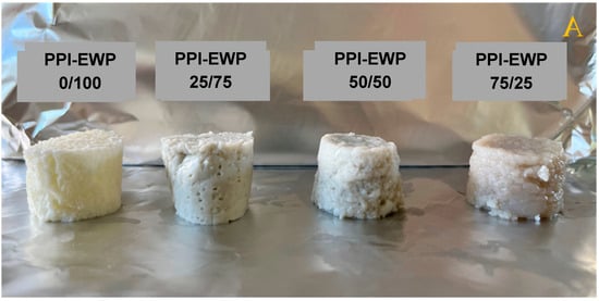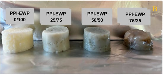 The macrostructure of the gels was characterized by analyzing their appearance and performing a texture profile analysis (TPA). The appearance of PPI-EWP gels at the different weight ratios is shown in Figure 2. Since PPI alone barely gelled (at pH 7.5) or did not gel at all (at pH 9.0), the 100% PPI samples are not presented.