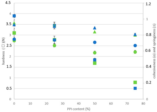Hardness (squares), cohesiveness (circles), and springiness (triangles) of PPI-EWP gels as a function of PPI content at pH 7.5 (green) and 9.0 (blue).