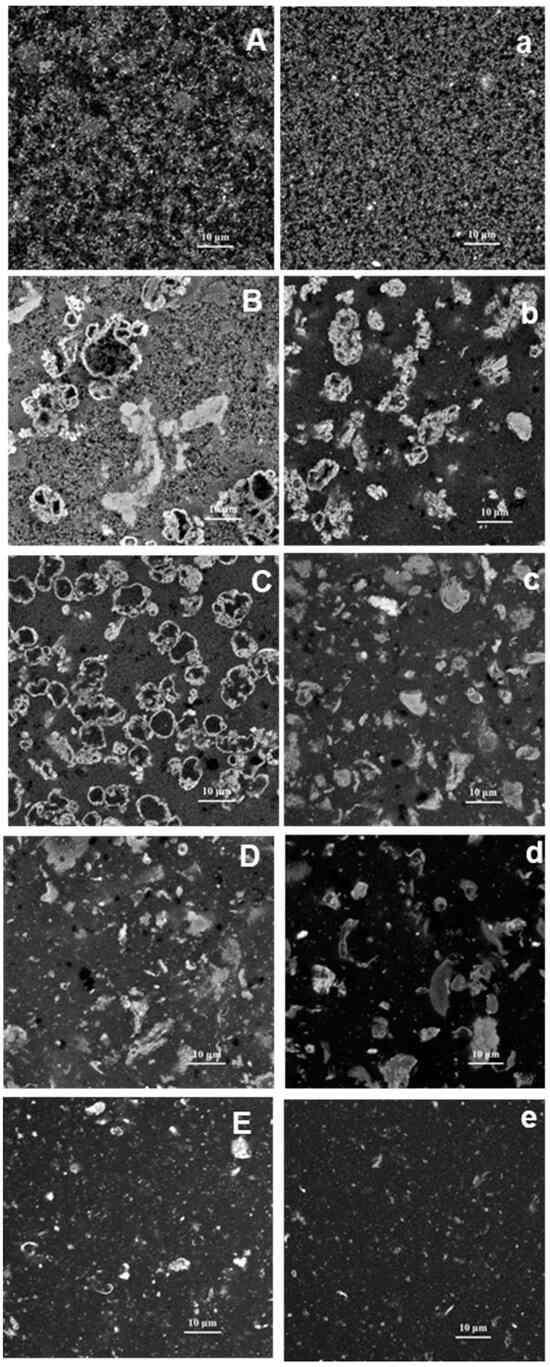 Figure 4E,e show the microstructure of heated PPI at pH 7.5 and 9.0, respectively. At pH 9.0, protein particles and small aggregates were poorly interconnected, indicating no gel formation, as mentioned previously, whereas at pH 7.5, a denser protein network with gel-like properties was observed. Additionally, larger particles were seen at pH 7.5 (Figure 4E), while only spaced small particles were visible at pH 9.0 (Figure 4e). The higher repulsive force between protein particles at high pH may explain the formation of smaller aggregates with insufficient interconnections to form a solid network.