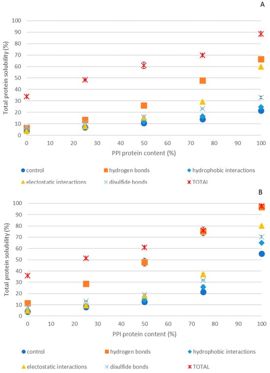 Protein solubilization from PPI-EWP gels as a function of PPI protein content at pH 7.5 (A) and 9.0 (B). Control (blue points) was obtained by solubilization in 100 mM Tris-HCl, hydrogen bonds (orange squares) were obtained by solubilization in 100 mM Tris-HCl + 8 mM urea, hydrophobic interactions (blue diamond) were obtained by solubilization in 100 mM Tris-HCl + 20% PG, electrostatic interactions (yellow triangles) were obtained by solubilization in 100 mM Tris-HCl + 2 M Gu-HCl; disulfide bonds (blue crosses) were obtained by solubilization in 100 mM Tris-HCl + 100 mM DTT and Total (red crosses) were obtained by solubilization in 100 mM Tris-HCl + 8 mM urea + 20% PG + 2 M Gu-HCl + 100 mM DTT.