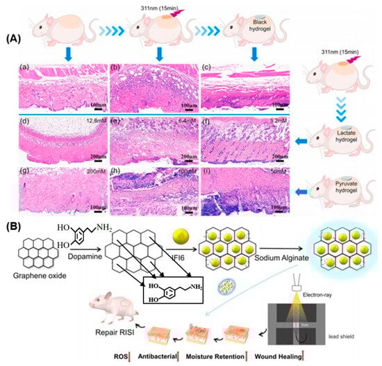 (A) Images of BALB/c mouse skin subjected to UV irradiation and treated with composite hydrogel films: (a) normal skin, (b) skin irradiated with 311 nm UV light, (c) hydrogels lacking pyruvate and lactic acid, (d–f) hydrogels containing varying concentrations of lactate (12.8, 6.4, and 3.2 mM), and (g–i), and hydrogels formulated with different levels of pyruvate (200, 100, and 50 mM); reproduced with permission [50], Elsevier. (B) Schematic diagram detailing the fabrication of IFI6-PDA@GO/SA and its role in healing radiation-induced skin injuries (RISIs) [51].