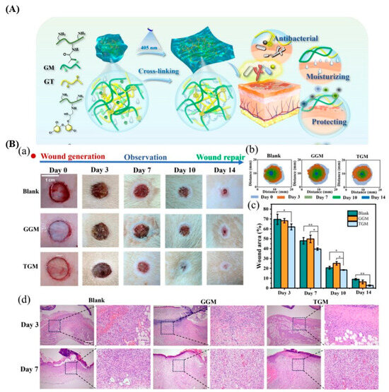 (A) Preparation and application of a gelatin-based antibacterial hydrogel (B). (a) Images showing wounds treated with various dressings over time; (b) diagram of wound sizes at days 0, 3, 7, 10, and 14; (c) wound area analysis at each time point for each group (* p < 0.05; ** p < 0.01); (d) H&E staining images of wounds on days 3 and 7; reprinted with permission from [54]. Copyright © 2023, American Chemical Society.