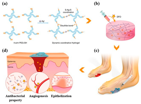 Natural polymers, such as polysaccharides and proteins, are readily available and easy to source, and their excellent biocompatibility and biodegradability make them popular in skin tissue engineering applications. However, due to their inherently weak mechanical properties, these polymers often require enhancements through techniques like grafting, multiple crosslinking, or blending with other materials to improve their strength [55]. Hydrogel dressing can be achieved by functionalizing a double-network chitosan/alginate hydrogel with collagen peptides, thereby boosting both its mechanical properties and biological activity. Carboxymethyl chitosan, a water-soluble chitosan derivative known for its water retention capacity, was used by Cao et al. [56] alongside collagen to formulate a hydrogel that closely resembles the human extracellular matrix, offering essential nutrients for cell growth and proliferation. Gelatin, derived from the partial hydrolysis of collagen, is frequently used in wound dressings. However, its capacity for water absorption and mechanical strength can be inadequate. To overcome these limitations, Liu et al. [57] combined gelatin with poly (γ-glutamic acid) (γ-PGA) to produce hydrogels that not only absorb body fluids effectively but also expedite wound closure. Synthetic polymers, such as polyethylene glycol, polydopamine, polyacrylamide, and polyvinyl alcohol, present distinct benefits for skin tissue engineering due to their adjustable molecular weights and diverse properties [58]. These materials typically offer superior mechanical strength and more controlled biodegradation rates compared to natural polymers. Polyethylene glycol is particularly valued for its biocompatibility and water solubility, serving effectively in drug and nanoparticle delivery systems. For instance, a PEG-based hydrogel was created with thioketal bonds that respond to reactive oxygen species, making it suitable for delivering epidermal growth factors [59]. Vascular regeneration is essential for effective nutrient delivery and oxygen exchange during skin repair. Chen et al. [60] formulated an injectable hydrogel using four-arm thiolate polyethylene glycol (SH-PEG) and silver nitrate (AgNO3) through coordinated cross-linking, incorporating the angiogenic agent deferoxamine (DFO). This hydrogel effectively promoted angiogenesis, enhancing vascular network formation and extending blood vessel length, while the presence of DFO enhanced the antibacterial efficacy of silver ions (Ag+) (shown in Figure 3).