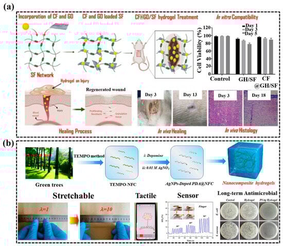 (a) The synthesis of graphene/silk cellulose composite hydrogel infused with ciprofloxacin (CIP) and its application in wound healing; reproduced with permission from Ref. [75], Springer Nature. (b) Antibacterial hydrogels with metal nanoparticles: fabrication and characterization of cellulose composite hydrogel for sensor applications; reproduced with permission from Ref. [83], Elsevier.