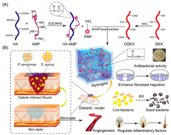 (A) Schematic depiction of HA-AMP, OEDX, and multifunctional ODEX/HA-AMP/PRP hydrogel synthesis. (B) Schematic overview of composite hydrogels used as wound dressings for healing diabetic infected wounds and skin reconstruction; reproduced with permission from Ref. [85], Elsevier.