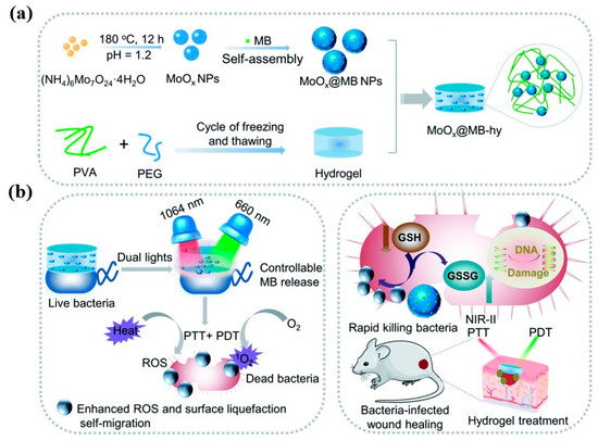 (a) Synthesis of photodynamic and photothermal synergistic antibacterial hydrogels (MoOx@MB). (b) Schematic illustration of the synergistic antibacterial effect of PTT-PDT [87].