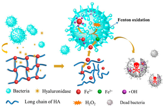 Mechanism of bacteria-induced antimicrobial activation in HA−Fe−EDTA hydrogel [108].