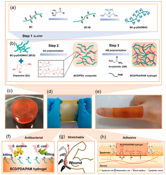Schematic of the stretchable, adhesive, and antibacterial hydrogel. (a) Preparation of bacterial cellulose derivative by using surface-initiated atom transfer radical polymerization graft from bacterial cellulose. (b) Formation of hydrogel. (c–e) Different shapes of hydrogel. (f) Quaternary ammonium salts of bacterial cellulose derivative provide the antibacterial hydrogel. (g) Stretchable hydrogel covers the elbow joint completely. (h) Catechol groups of polydopamine components promote tissue adhesion of hydrogel [112].