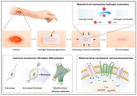 Mechanically active wound healing hydrogels: stimuli-responsive dressings contract to enhance healing, inducing fibroblast differentiation into myofibroblasts and activating gene expression changes via the PI3K pathway; reproduced with permission from Ref. [123], Elsevier.