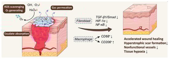 - Kang, Y.; Liu, X.; Wang, J.; Peng, P.; Liang, M.; Wang, Q.; Zheng, W.; Li, S.; Gao, C. Rod-Shaped Microgel Scaffolds with Interconnective Pores and Oxygen-generating Functions Promote Skin Wound Healing and Alleviate Hypertrophic Scar Formation. Adv. Funct. Mater. 2025, 35, 2413678. [Google Scholar] [CrossRef]