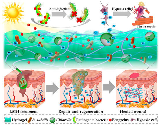 A similar investigation has been reported regarding living microecological hydrogels aimed at wound healing by introducing a living microecological hydrogel (LMH) designed to promote chronic wound healing by encapsulating functionalized Chlorella and Bacillus subtilis. The LMH facilitates continuous oxygen delivery and possesses anti-infection properties, effectively addressing the issues of hypoxia and infections commonly associated with hard-to-heal wounds. Composed of thermosensitive Pluronic F-127 and wet-adhesive polydopamine, the hydrogel remains in a liquid state at low temperatures but quickly solidifies and adheres tightly to the wound bed upon application. By optimizing the encapsulation ratio of the microorganisms, Chlorella can continuously produce oxygen, fostering the proliferation of B. subtilis, which, in turn, helps to eliminate pathogenic bacteria. Consequently, the LMH significantly enhances the healing process of infected diabetic wounds, highlighting its potential for practical clinical applications in wound management, as shown in Figure 14 [191].
