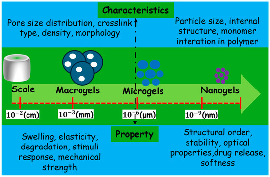 Structure–property relationship of macrogels, microgels, and nanogels formed at varying scales.
