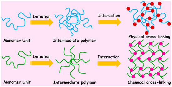 Schematic representation of physical and chemical cross-linking between polymer chains in a hydrogel.