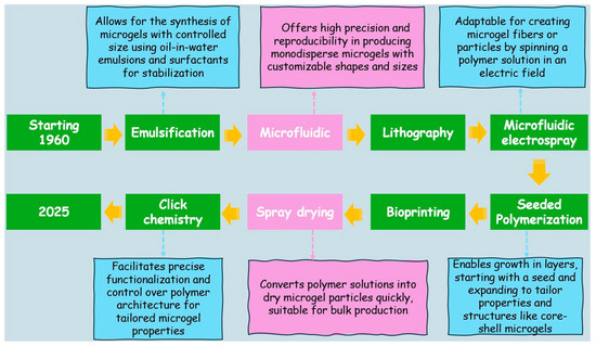 Microgels are fascinating materials that can be synthesized from natural or synthetic polymers through both covalent and non-covalent cross-linking techniques [160,161]. Based on the nature of cross-linking, microgels are grouped into two primary categories: chemical microgels and physical microgels. Chemical microgels are constructed using covalent bonds, typically facilitated by cross-linking agents or enzymes such as glutaraldehyde, epichlorohydrin, and glutamine aminotransferase, creating robust polymer networks [162,163]. In contrast, physical microgels form their networks through non-covalent interactions—such as hydrogen bonds, hydrophobic interactions, and ionic or electrostatic forces—under specific environmental conditions like temperature, pH, or ionic strength. Although these physical interactions provide a degree of flexibility, they tend to be reversible and less stable than covalent bonds [164,165]. With the growing interest in microgels over the past twenty years, numerous fabrication techniques have been developed and refined. These methods can be categorized into four fundamental groups based on their physical principles: micro-molding, emulsion techniques, shearing methods, and extrusion processes [166]. Each of these fabrication strategies involves distinct requirements for materials and equipment. For instance, micro-molding necessitates specialized molds, while emulsion methods leverage a combination of immiscible liquids—primarily oil and water—mixed in a way that creates water-in-oil droplets, eliminating the need for a mold. The details of the fabrication strategy are shown in Scheme 3. In the “top-down” approach to microgel creation, larger macro gel structures are mechanically broken down, a process often referred to as broken gels. This can be accomplished through various mechanical means, including grinding, ultrasound, or high-pressure homogenization. The characteristics of the microgels produced by top-down methods, including size and shape, are influenced by factors such as the type of raw material used, the applied stress levels, and processing rates and durations [167,168].