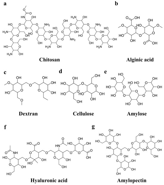 Structural formulas of selected polysaccharides: (a) chitosan; (b) alginic acid; (c) dextran; (d) cellulose; (e) amylose; (f) hyaluronic acid; (g) amylopectin.