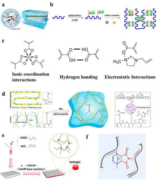(a–c) Physical crosslinked hydrogels [71,72,73]: (a) hydrogen bonding [71]; (b) ionic interactions [73]; and (c) ionic coordination interactions, hydrogen bonding, and electrostatic interactions [72]. (d–f) Chemical crosslinked hydrogels [74,75,76]: (d) Michael reaction [74]; (e) Schiff base reaction [75]; and (f) Diels–Alder click reaction [76].