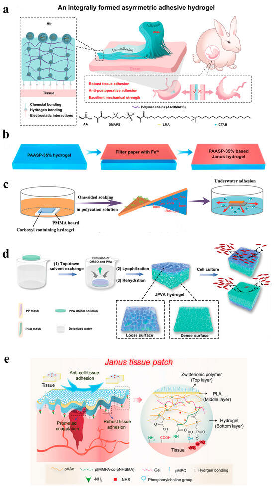 The unilateral treatment method is a common technique for the preparation of Janus hydrogels, imparting distinct properties to one side of the hydrogel through selective treatment (Figure 4b–d) [103,104]. This approach is simple to operate and easy to control and enables the realization of multiple functions, including anti-adhesion, drug delivery, and sensing. For example, Jia et al. achieved single-sided adhesion by spraying a cationic solution onto one side of the powder. It uses the interaction between the cation and the negatively charged groups on the surface of the material to eliminate viscosity [106]. This method was not only easy to operate but also highly controllable. By selecting different cationic solutions or adjusting the concentration of the spray, the strength of the adhesion can be precisely controlled to suit different application needs. Its unique Janus adhesion characteristics provided an effective solution for postoperative adhesion while avoiding adhesion to the surrounding tissue. In addition, fast-Janus-gelation (FJG) powder has robust mechanical properties to adapt to the movement of different organs and degrade safely in vivo. Its convenient storage and delivery further enhanced its potential for application in minimally invasive surgery. In addition, Cui et al. successfully prepared carboxyl-containing hydrogels with excellent performance using an innovative gradient polyelectrolyte complexation strategy (as shown in Figure 4b). It solved the problem of carboxyl group instability in a normal saline environment [103]. They immersed the top surface of a carboxyl-based polymer hydrogel in a polycationic solution, while the bottom surface was designed to avoid contact with the solution, thus creating a physical barrier. This hydrogel replaces traditional suturing methods, with the sticky side firmly adhering to the damaged area, while the other side effectively prevents adhesion. In vivo experiments have confirmed that this hydrogel can degrade and repair the perforated stomach well.