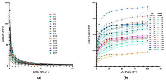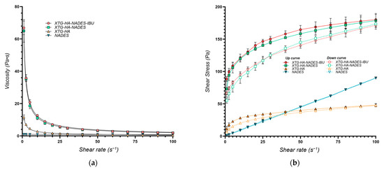 Rheological properties of the XTG-HA eutectogels: (a) Viscosity as a function of shear rate. The continuous lines represent the power law fittings for each formulation, highlighting the shear-thinning behavior typical of these gels; (b) Shear stress as a function of shear rate. Both the upward (solid symbols) and downward (open symbols) curves are plotted, illustrating the hysteresis loop observed in each formulation.