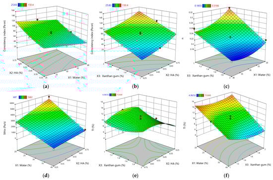 Response surface plots for rheological and thixotropic properties of XTG-HA eutectogels: (a) Consistency index (Pa·sⁿ) as a function of water (%) and HA (%); (b) Consistency index (Pa·sⁿ) as a function of XTG (%) and HA (%); (c) Flow behavior index (n) as a function of water (%) and XTG (%); (d) Sthix (Pa·s−1) as a function of water (%) and HA (%); (e) TI (%) as a function of XTG (%) and HA (%); (f) TI (%) as a function of water (%) and XTG (%). Only graphs including very significant influences (p < 0.0001) are depicted.