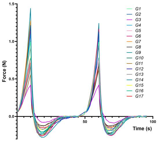 Figure 3 presents compression–decompression profiles for each formulation (G1–G17), highlighting distinct responses to mechanical stress and underscoring differences in hardness, adhesiveness, and cohesiveness.