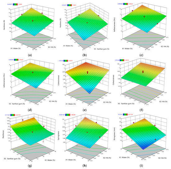 Response surface plots for textural properties of XTG-HA eutectogels: (a) Hardness (N) as a function of water (%) and HA (%); (b) Hardness (N) as a function of water (%) and XTG (%); (c) Adhesiveness (N·s) as a function of water (%) and HA (%); (d) Adhesiveness (N·s) as a function of water (%) and XTG (%); (e) Cohesiveness as a function of water (%) and HA (%); (f) Cohesiveness as a function of XTG (%) and HA (%); (g) Resilience as a function of water (%) and XTG (%); (h) Springiness as a function of water (%) and HA (%); (i) Stringiness (mm) as a function of water (%) and HA (%). Only graphs including very significant influences (p < 0.0001) are depicted.