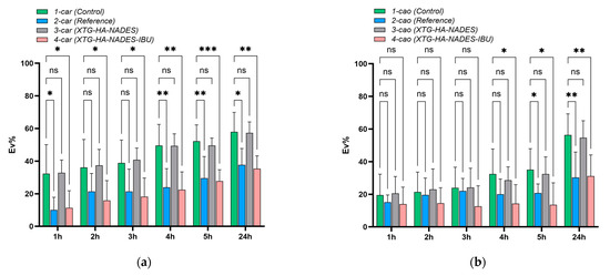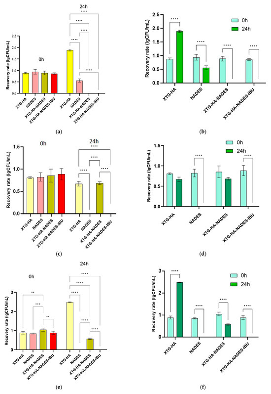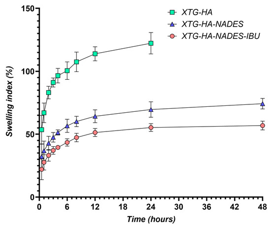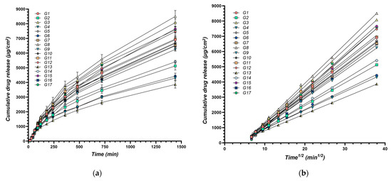 By analyzing these kinetic parameters, this study aims to elucidate the impact of formulation variables on drug release profiles. Understanding these influences can guide the development of XTG-HA eutectogels with tailored drug delivery characteristics, optimizing both the initial burst and sustained release of the therapeutic agent to meet the specific needs of various clinical scenarios. The cumulative amount of IBU diffused through membranes over time for all experimental formulations is presented in Figure 5.