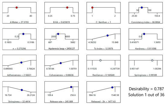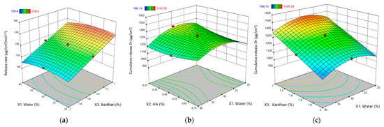 Interestingly, a negative interaction (X1X2) between water and HA was observed, indicating that excessive water counteracts HA’s thickening role and underscoring the importance of balancing water and HA for optimal hardness. Similar observations have been reported in composite polysaccharide formulations, where a precise water content ensures polymer–polymer interactions remain favorable for maintaining structural integrity [36].