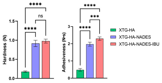 The textural properties of XTG-HA eutectogels are critical for their performance in pharmaceutical and cosmetic applications. These properties, including the hardness (Y5), adhesiveness (Y6), cohesiveness (Y7), resilience (Y8), springiness (Y9), and stringiness (Y10), provide insight into the mechanical behavior and user experience of the gels [52,84]. These mechanical attributes not only affect user experience—for instance, how easily a gel can be applied or removed—but also influence drug release, mucosal retention, and overall stability [85,86,87].